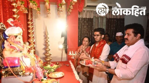 महाराष्ट्राच्या कानाकोपऱ्यात गणेशोत्सवाची धामधूम सुरू झाली आहे. 27 ऑगस्ट 2025 पासून विघ्नहर्ता गणपती बाप्पांचे आगमन प्रत्येक घरात, गल्लीबोळात आणि हृदयात उत्साहाने झाले आहे. टाळ-मृदुंगाच्या नादात, ढोल-ताशांच्या गजरात आणि शंखनादाच्या मंगल स्वरात बाप्पांचे स्वागत होत आहे. गजानना श्री गणराया, आधी वंदू तुझ्या पाया, विघ्नहर्ता आम्हा सर्वांना सुख-समृद्धी दे अशी प्रार्थना प्रत्येक मराठी मनातून उमटत आहे. गणरायाच्या आगमनाने घराघरांत भक्ती आणि आनंदाचा माहोल पसरला आहे. राजकीय नेतेही या उत्सवात सहभागी होऊन बाप्पाच्या चरणी नतमस्तक होत आहेत. महाराष्ट्रातील राजकीय नेत्यांच्या घरीही गणेशोत्सवाची रंगत पाहायला मिळाली.